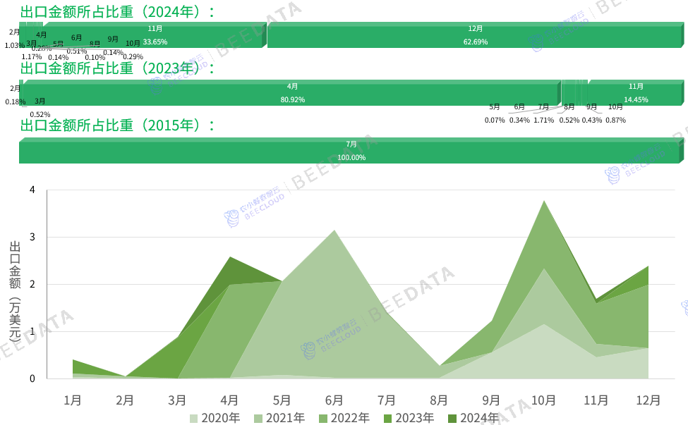 3。 从出口来看,2015年至2024年,中国牛油果出口量增加了530。68倍,年均复合增加率达100。84%;出口金额增加了16。12万美元,增加了416。63倍,年均复合增加率约为95。52%。2024年,中国牛油果出口次要从广东、、云南、福建等省域销往喷鼻港地域、澳门地域以及俄罗斯、新加坡、日本等地;并集中正在11月、12月,此中,11月份牛油果出口量正在全年牛油果出口量中所占的比沉约为31%,12月份牛油果出口量所占的比沉约为61。53%,逐步近似于国产牛油果产季正在月时间粒度上的分布态势。